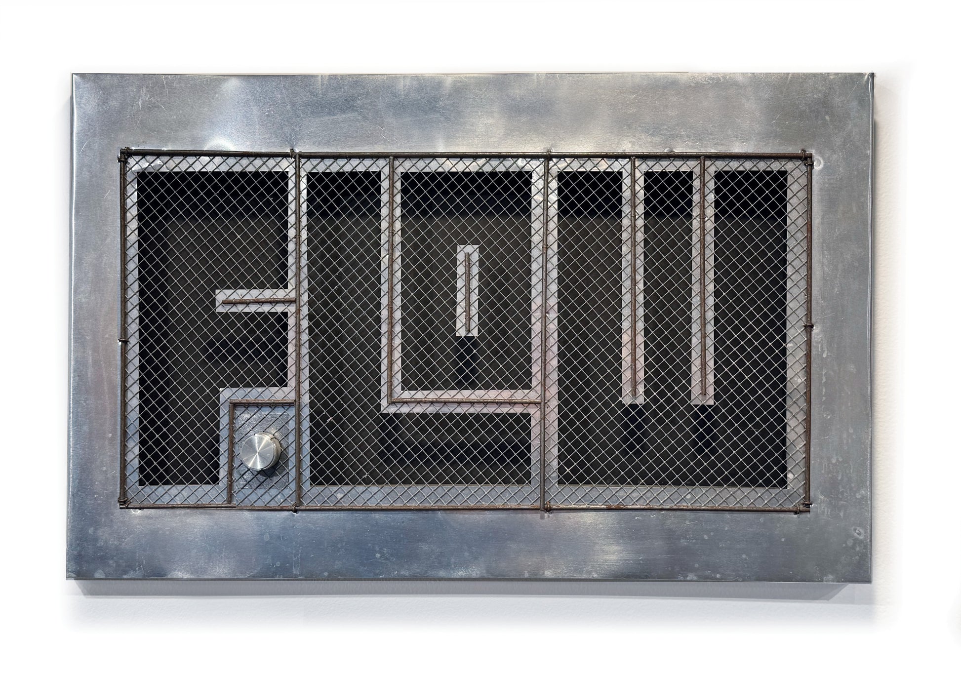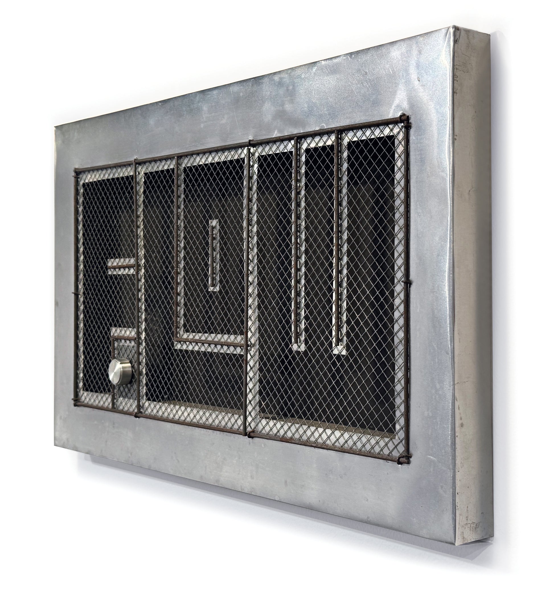 Sheet Metal and Mesh with Vintage Knob framed on Wood