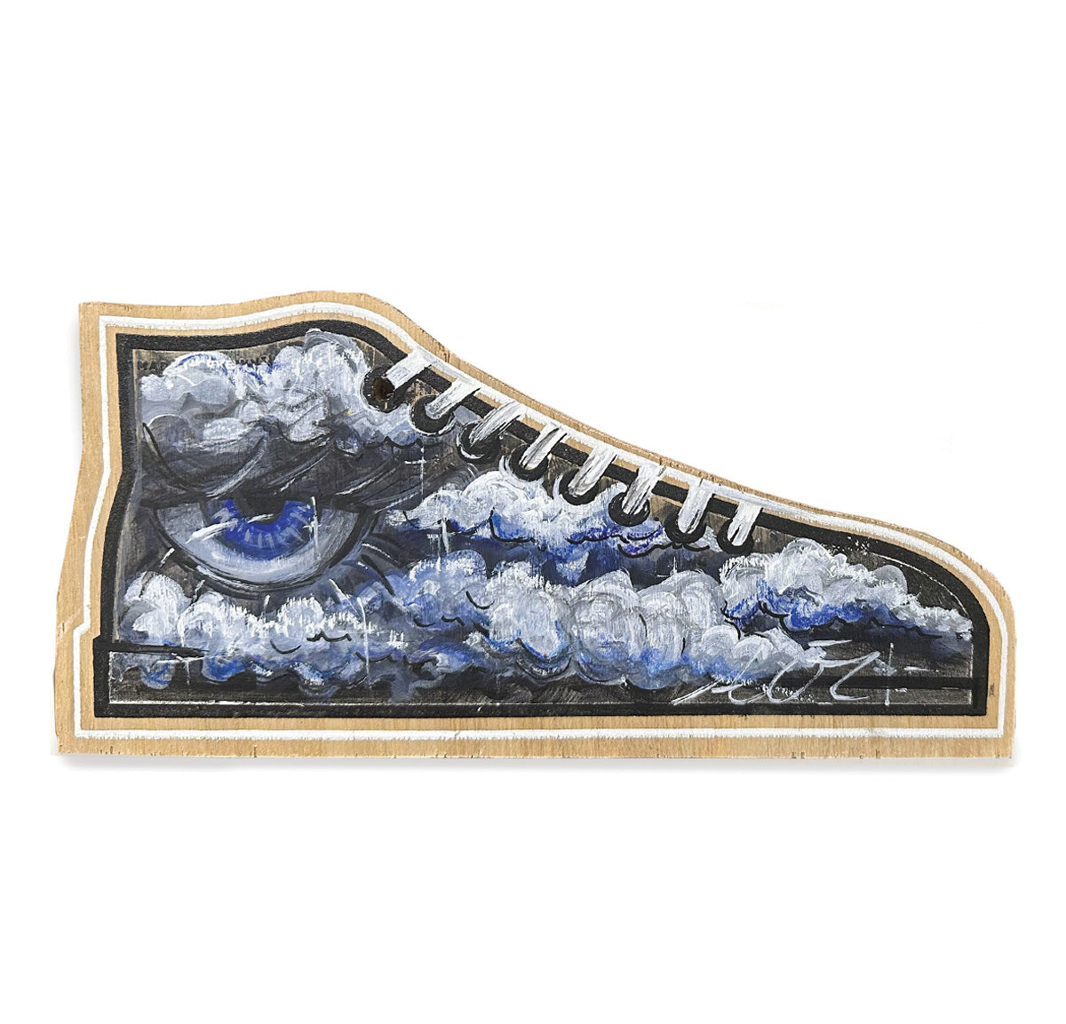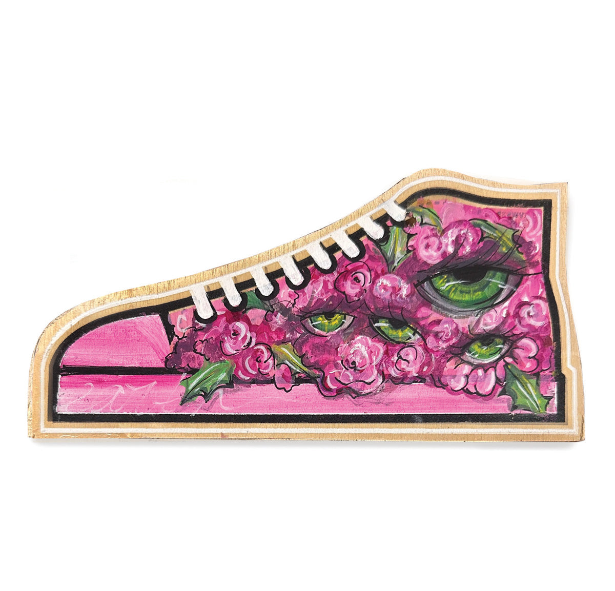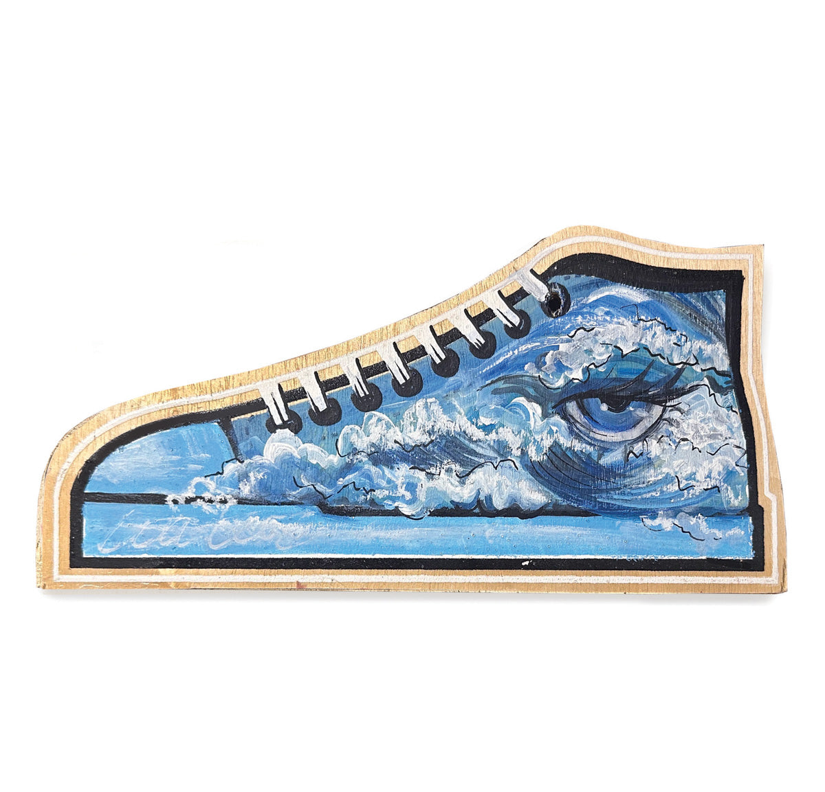One Pair (Two double-sided wooden shoes total) of Artist customized Skewville wooden shoes. Each shoe measures 11″ x 5.5″ x 0.5″ and is connected by a lace or wire.