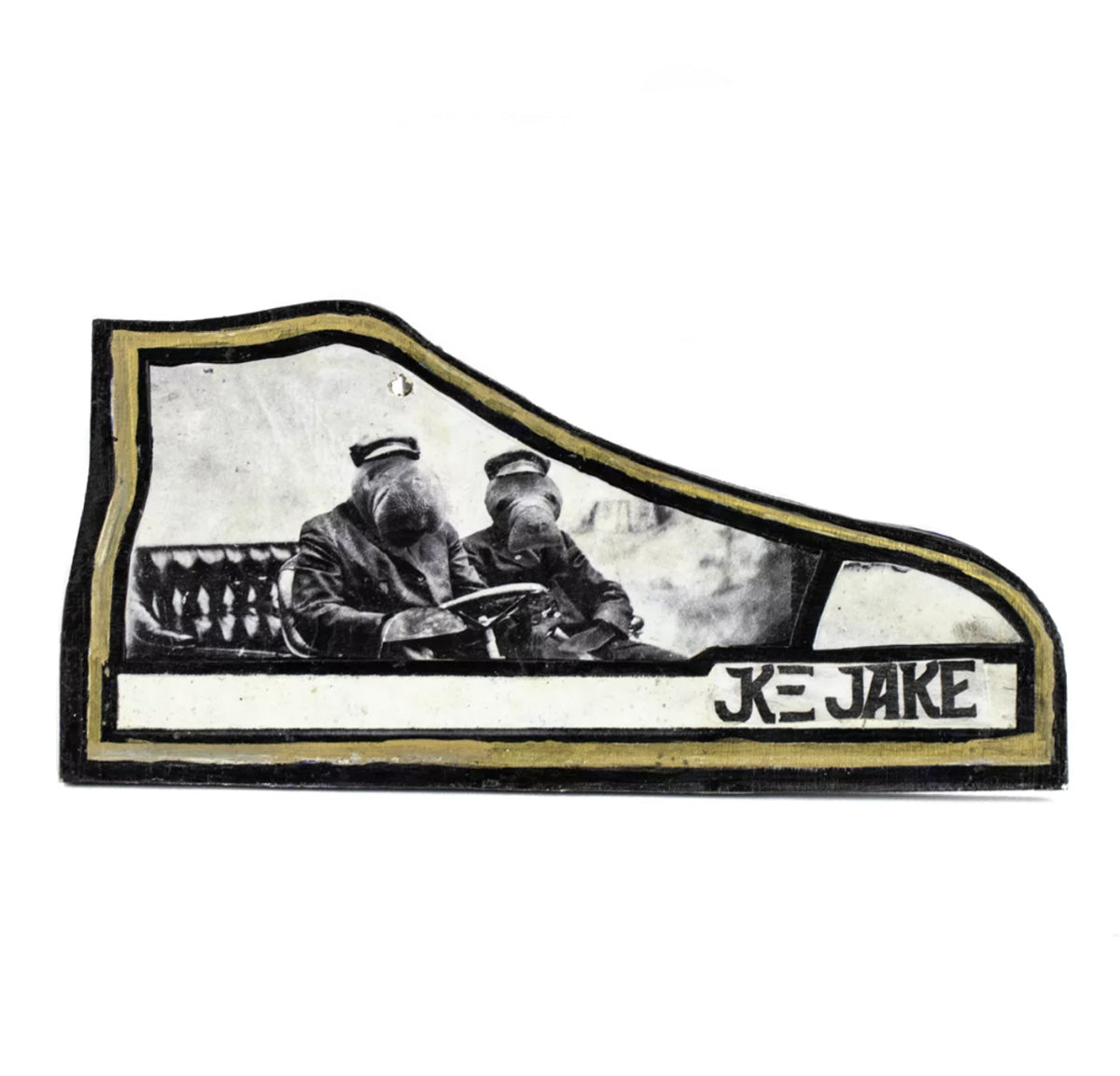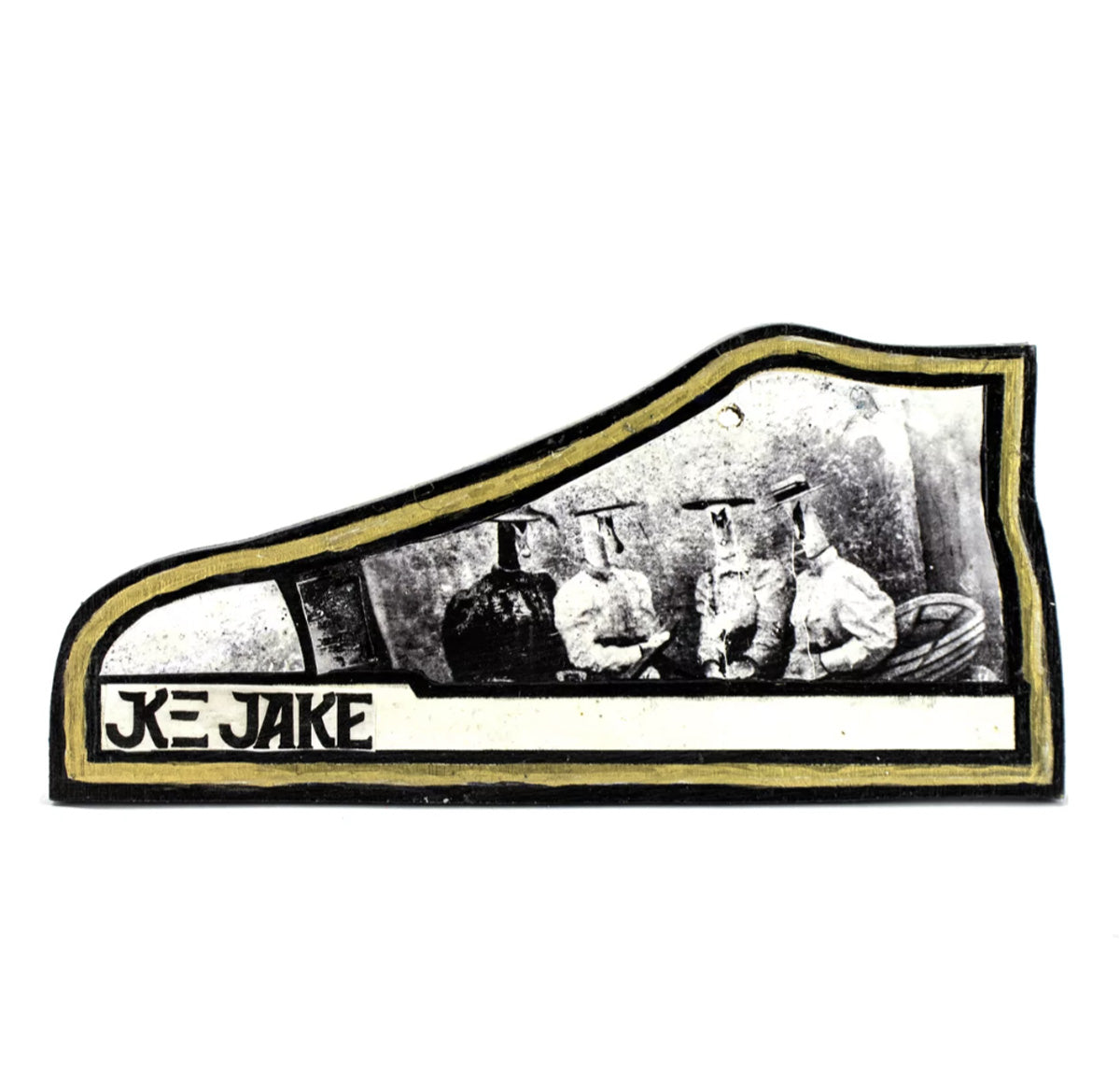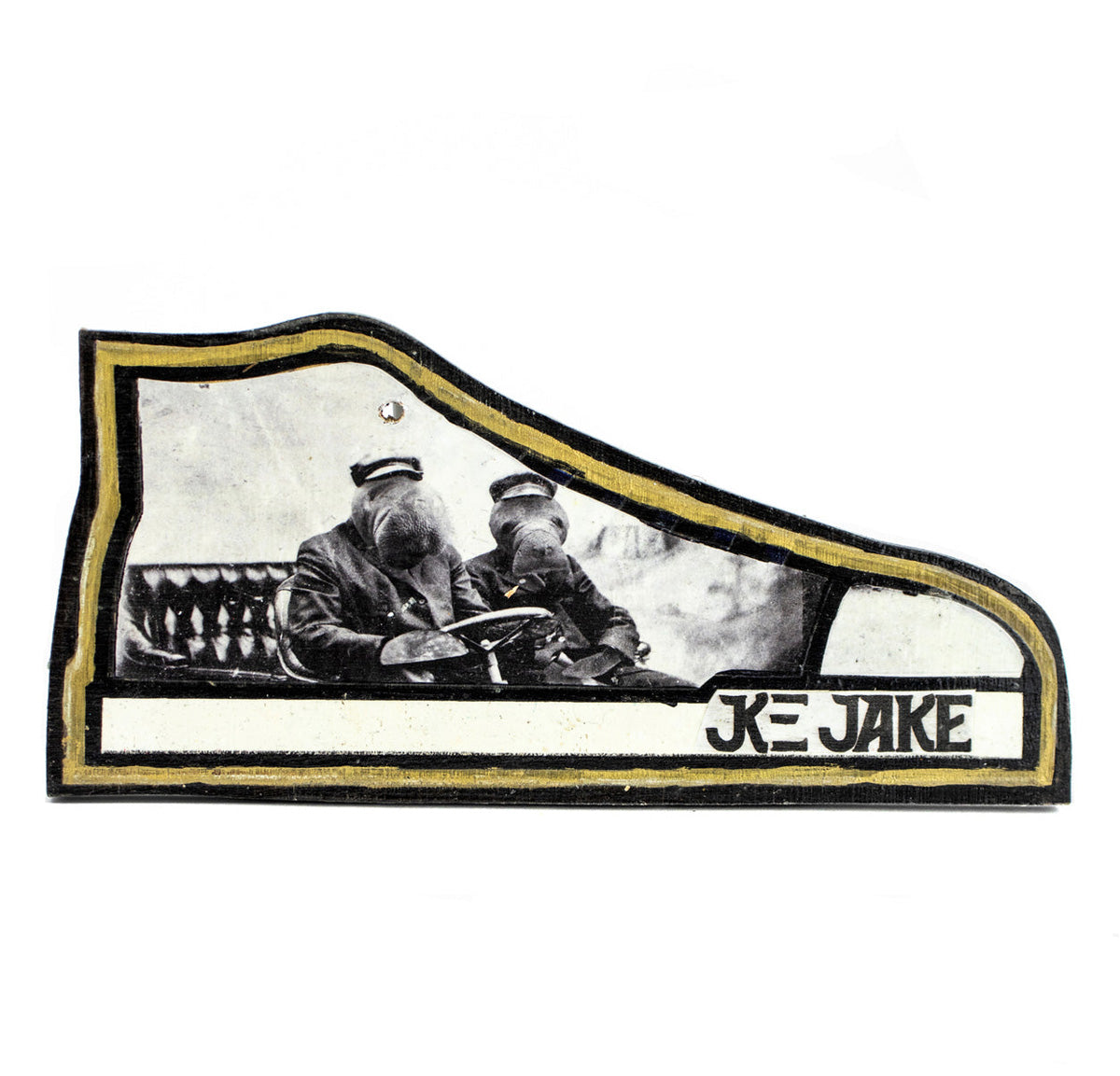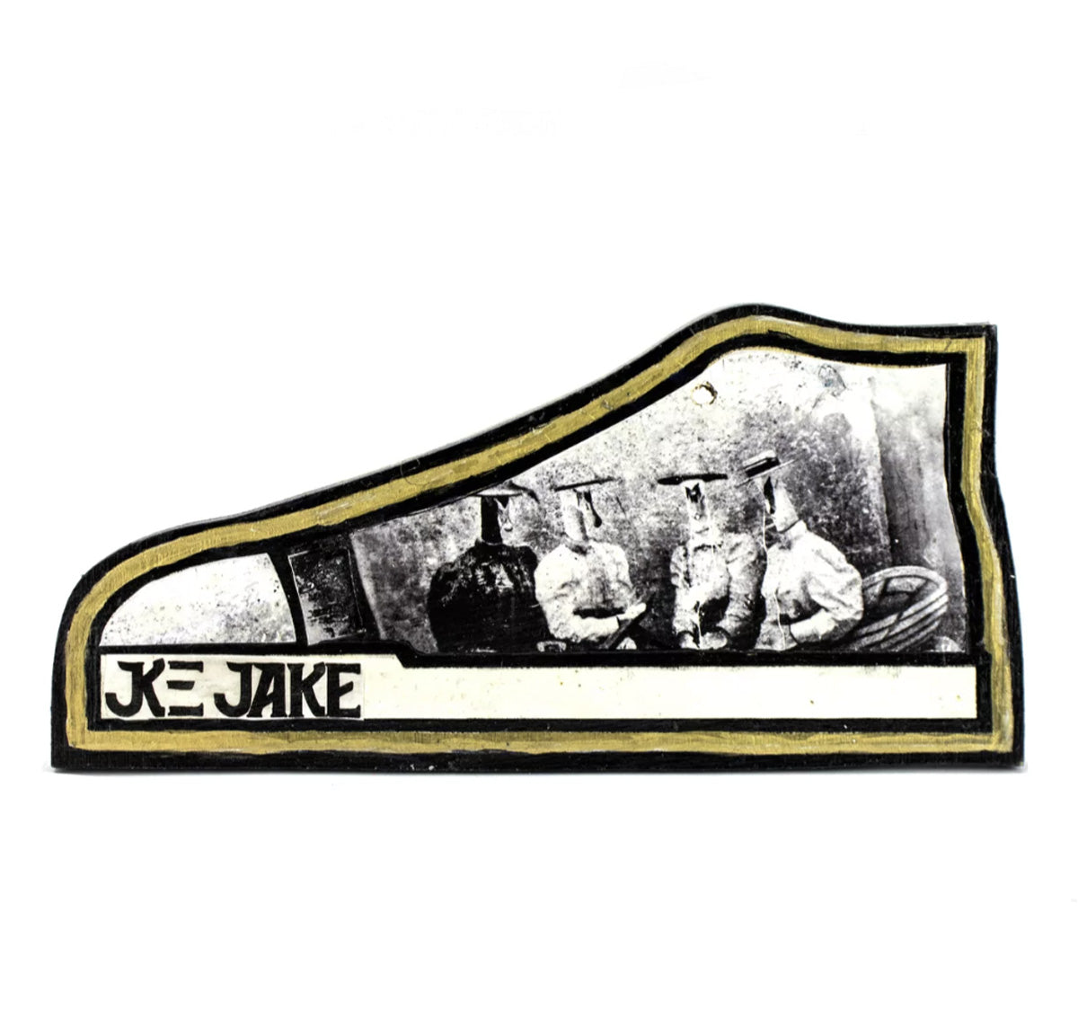 One Pair (Two double-sided wooden shoes total) of Artist customized Skewville wooden shoes. Each shoe measures 11″ x 5.5″ x 0.5″ and is connected by a lace or wire.