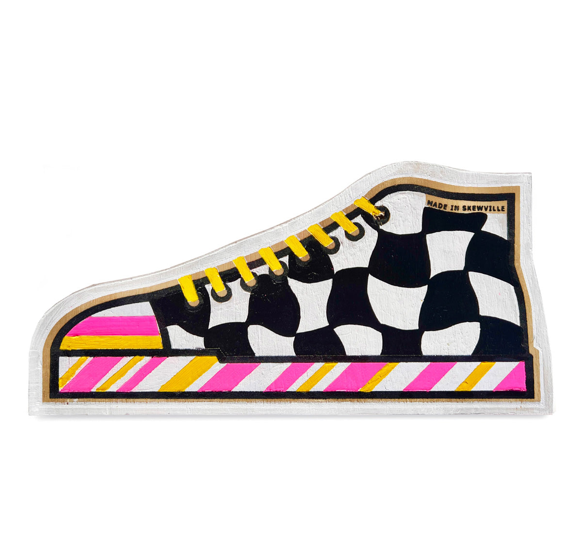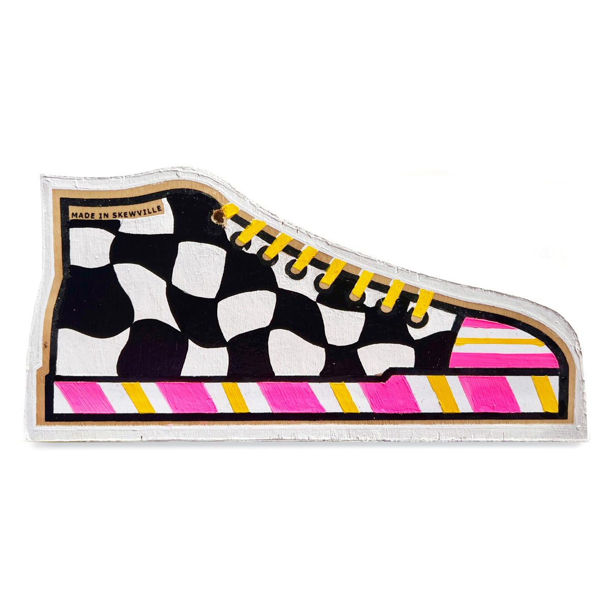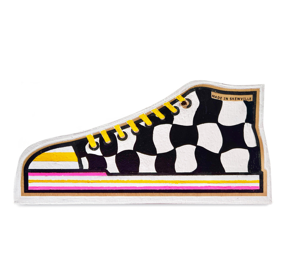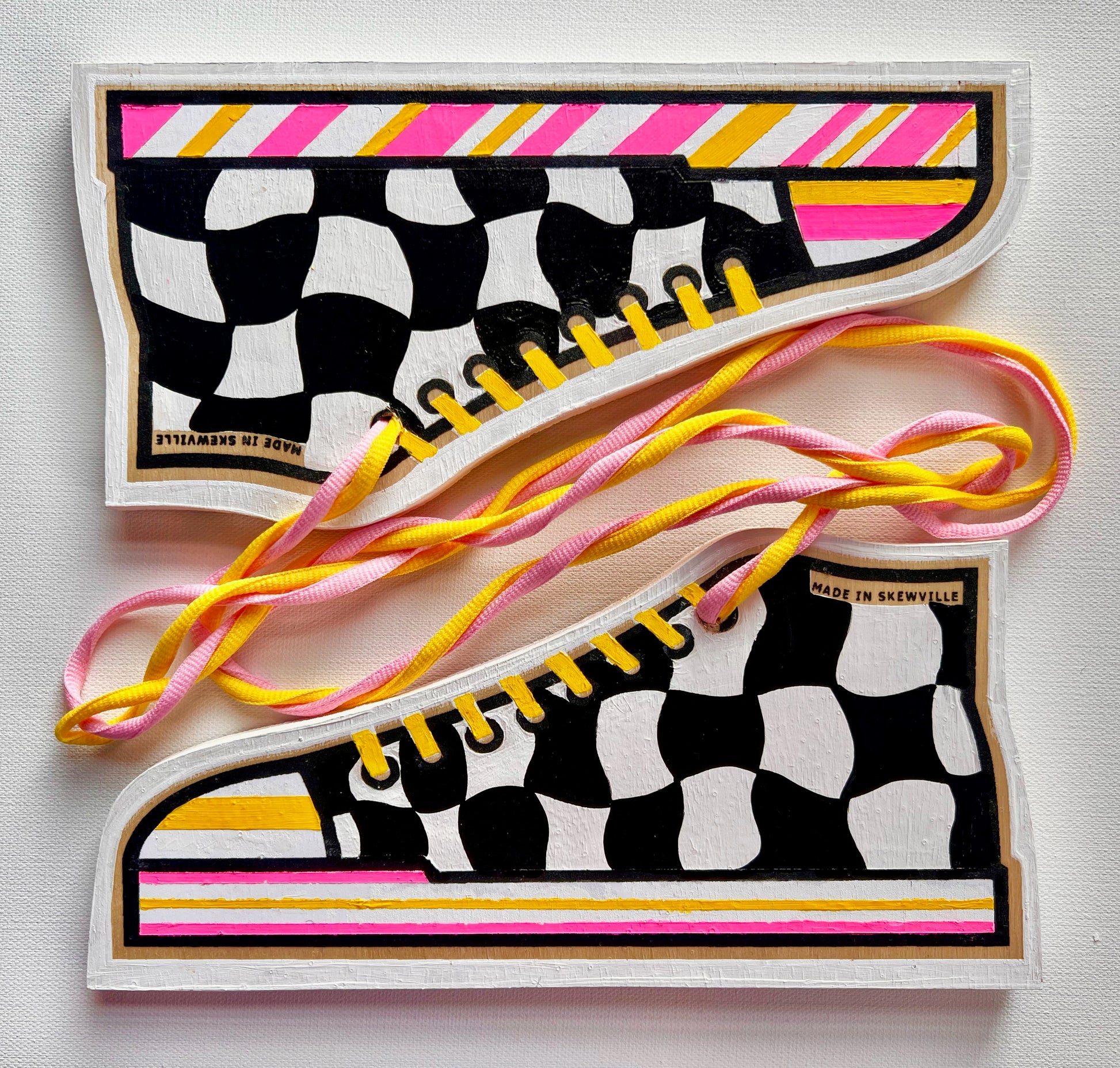 One Pair (Two double-sided wooden shoes total) of Artist customized Skewville wooden shoes. Each shoe measures 11″ x 5.5″ x 0.5″ and is connected by a lace or wire.