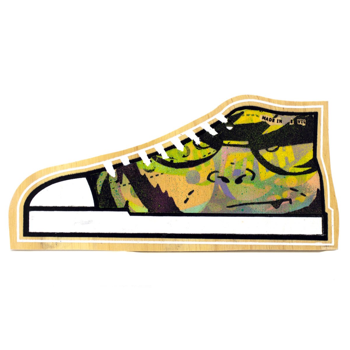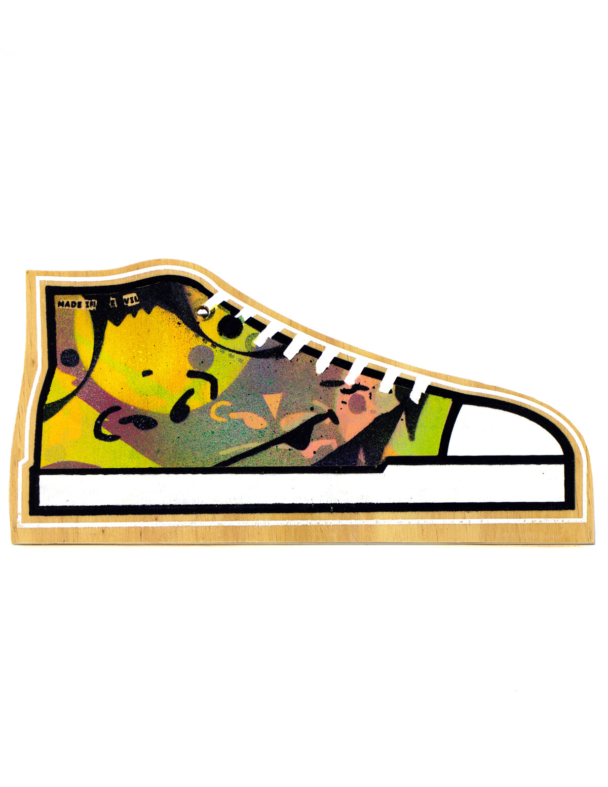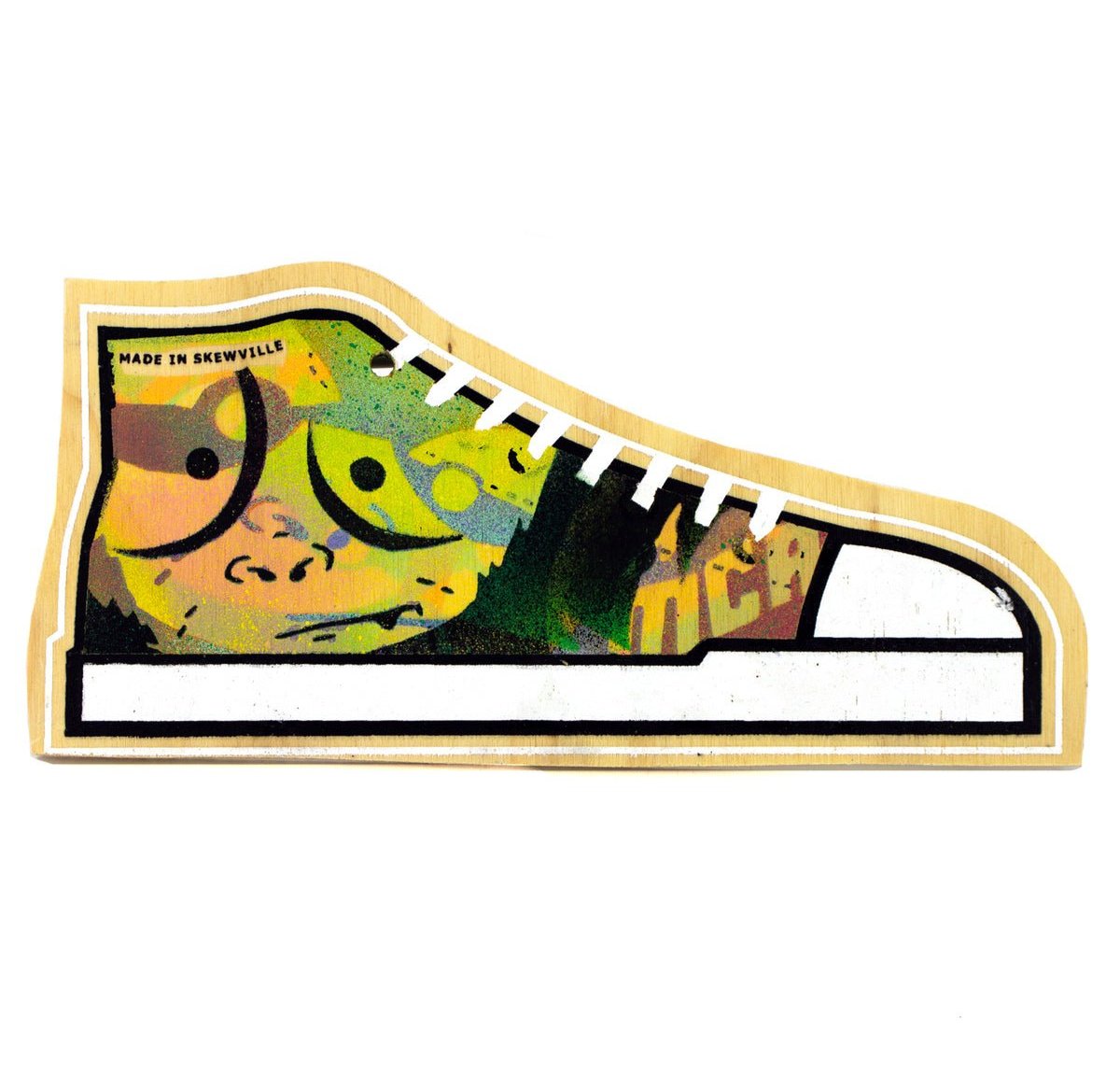 One Pair (Two double-sided wooden shoes total) of Artist customized Skewville Wooden shoes. Each Shoe measures 11″ x 5.5″ x 0.5″ and is connected by a lace or wire.
