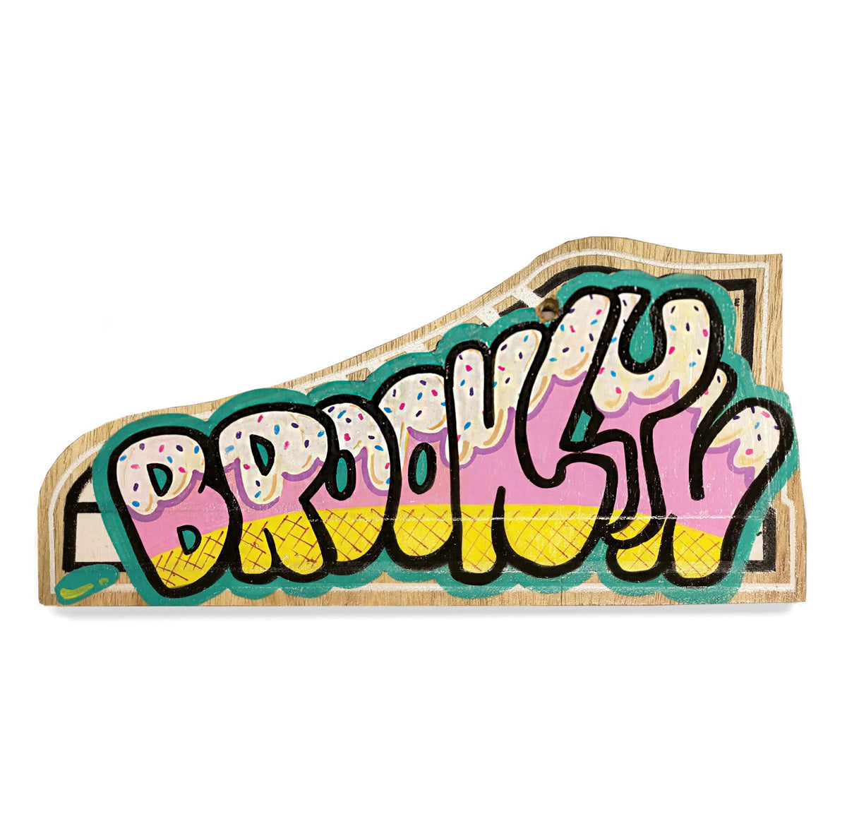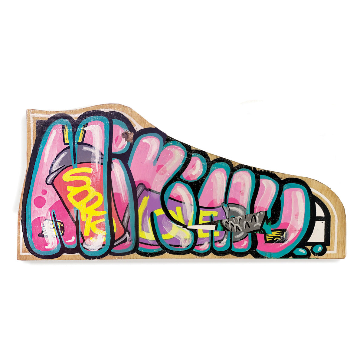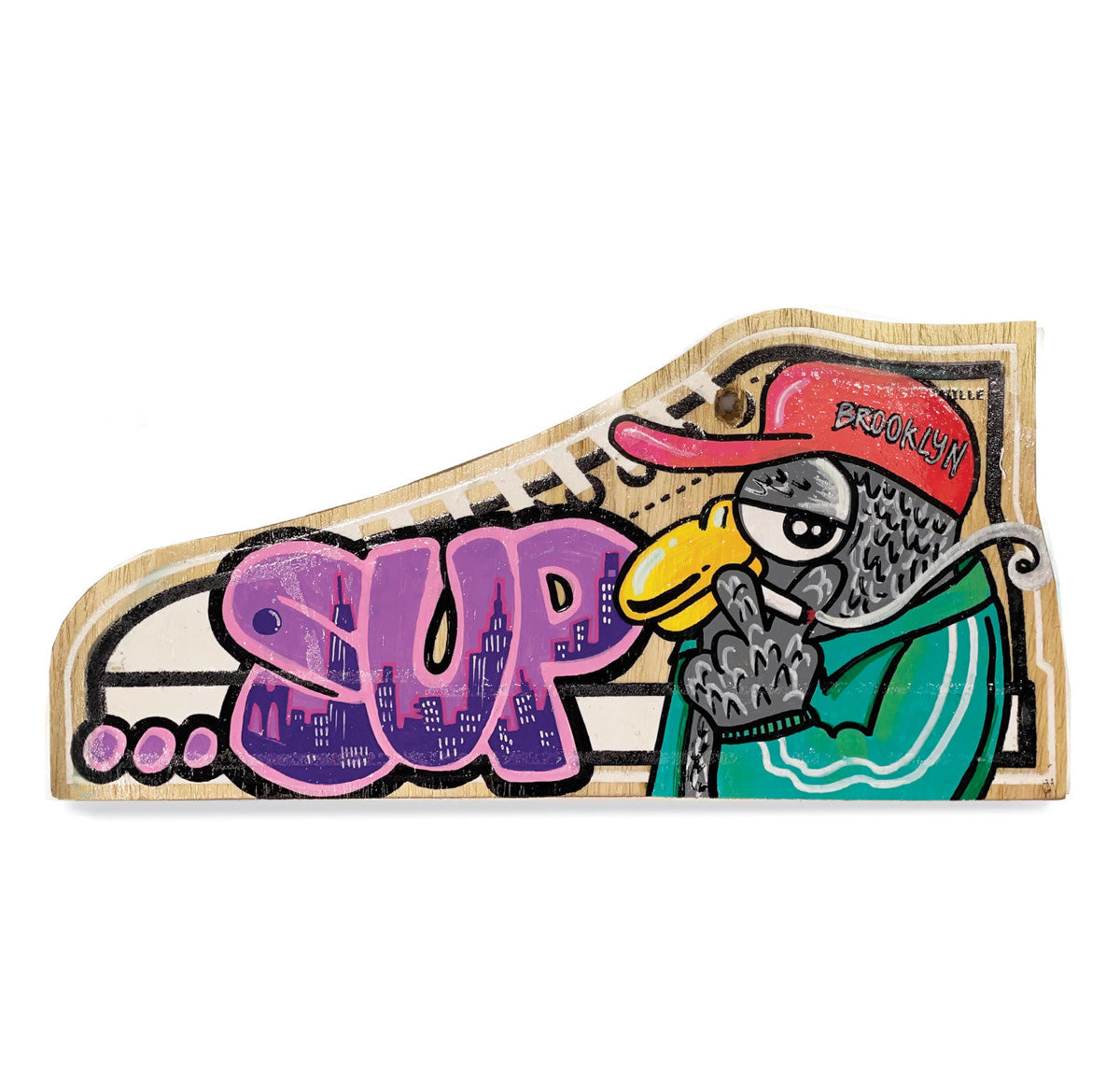 One Pair (Two double-sided wooden shoes total) of Artist customized Skewville Wooden shoes. Each Shoe measures 11″ x 5.5″ x 0.5″ and is connected by a lace or wire.