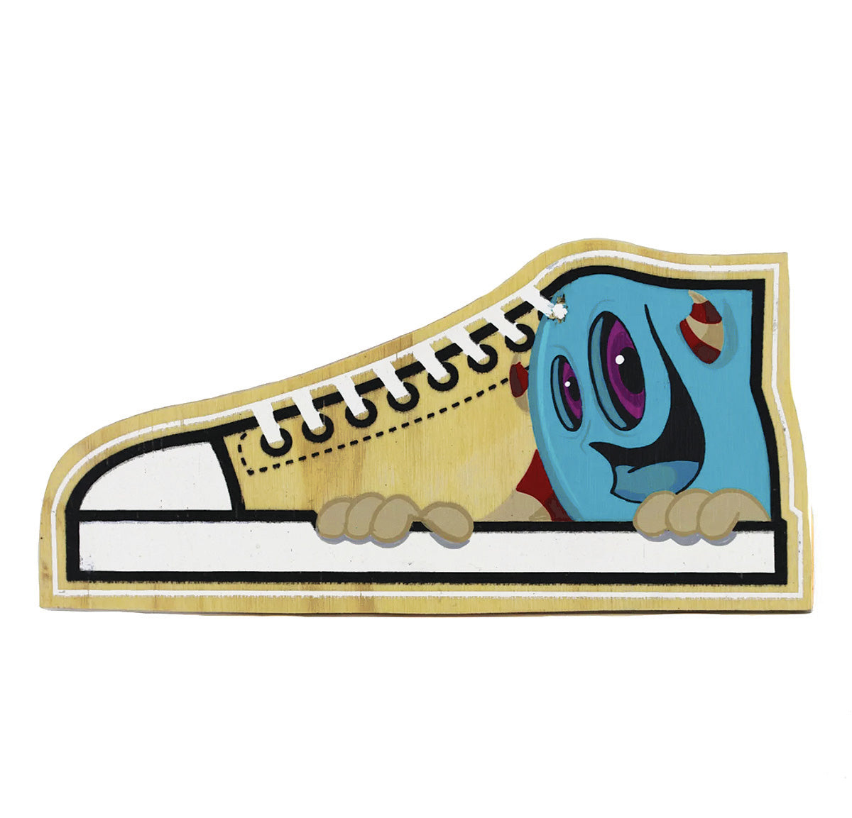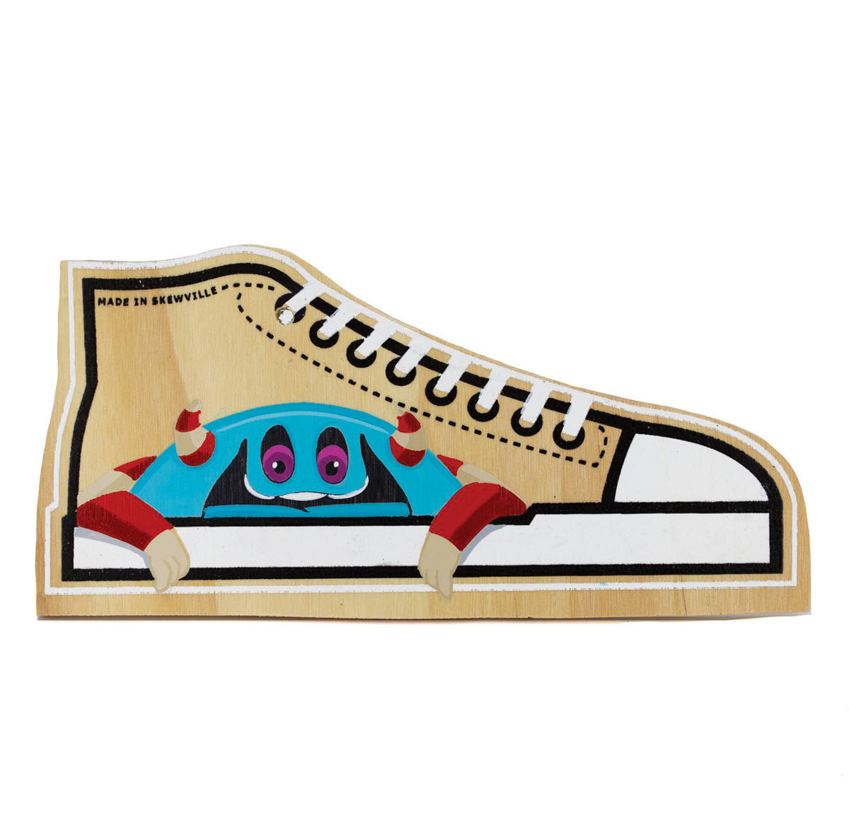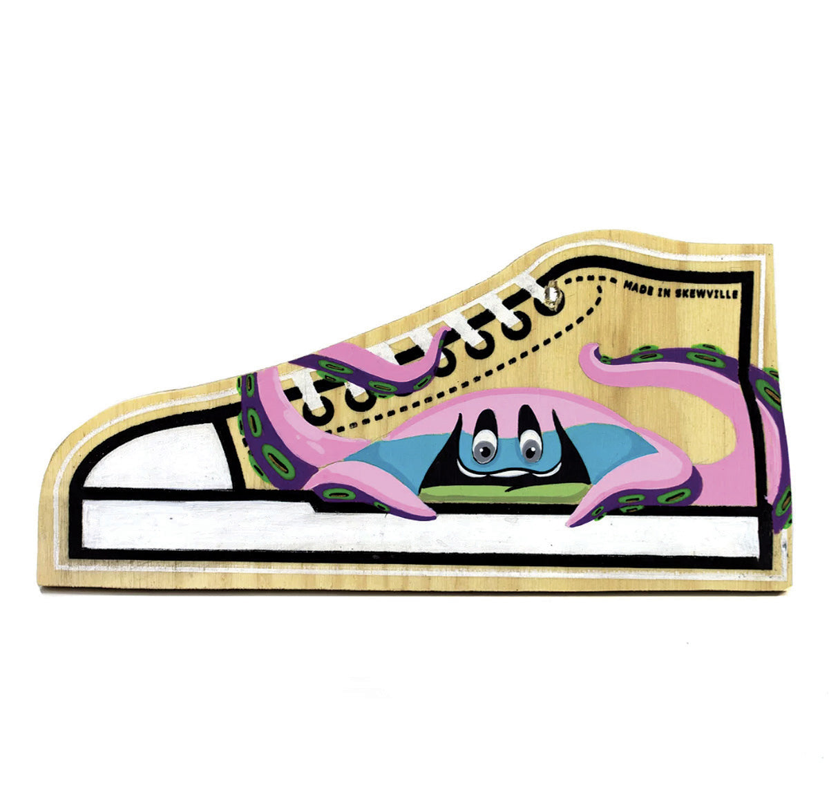 One Pair (Two double-sided wooden shoes total) of Artist customized Skewville wooden shoes. Each shoe measures 11″ x 5.5″ x 0.5″ and is connected by a lace or wire.