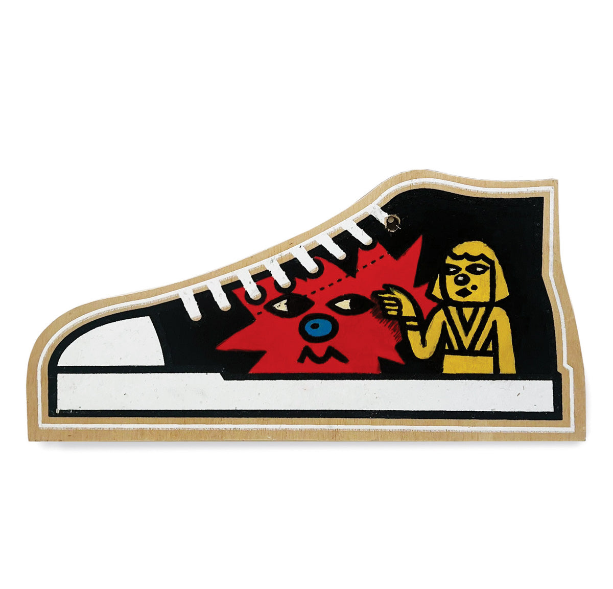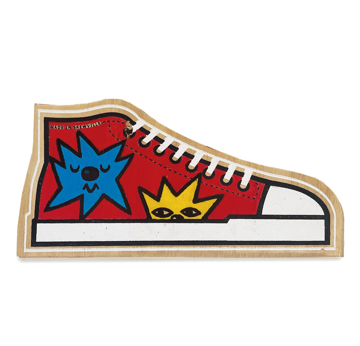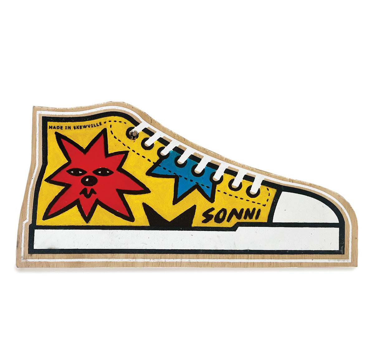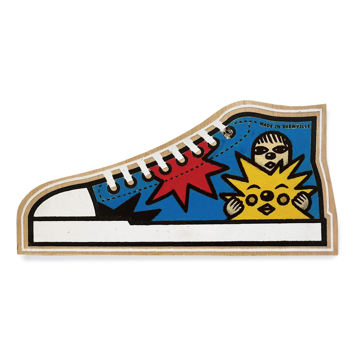 One Pair (Two double-sided wooden shoes total) of Artist customized Skewville wooden shoes. Each Sshoe measures 11″ x 5.5″ x 0.5″ and is connected by a lace or wire.