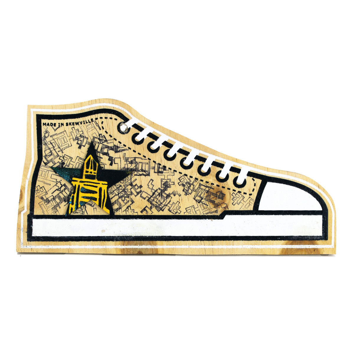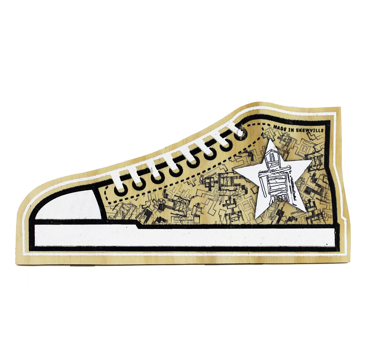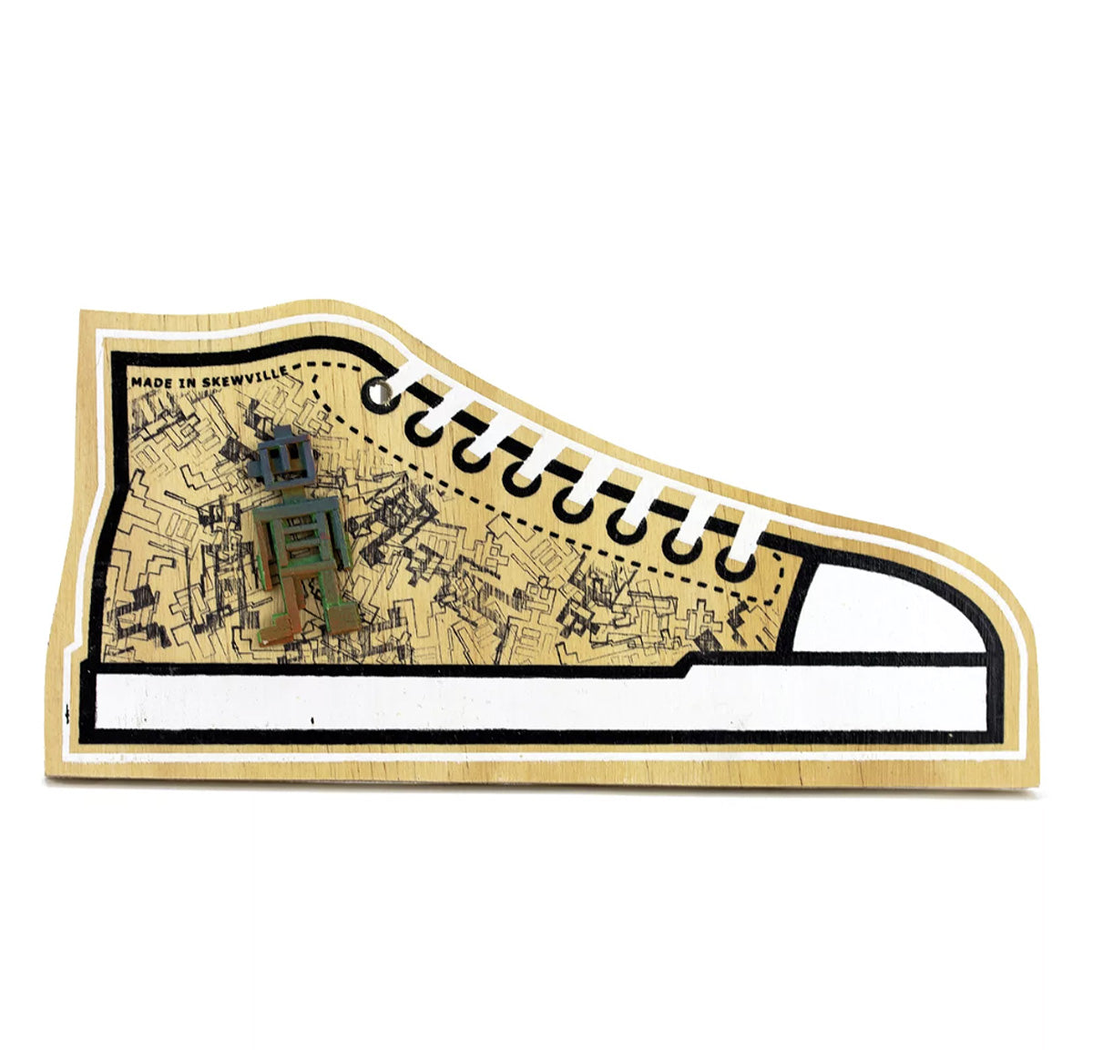 One Pair (Two double-sided wooden shoes total) of Artist customized Skewville wooden shoes. Each shoe measures 11″ x 5.5″ x 0.5″ and is connected by a lace or wire.