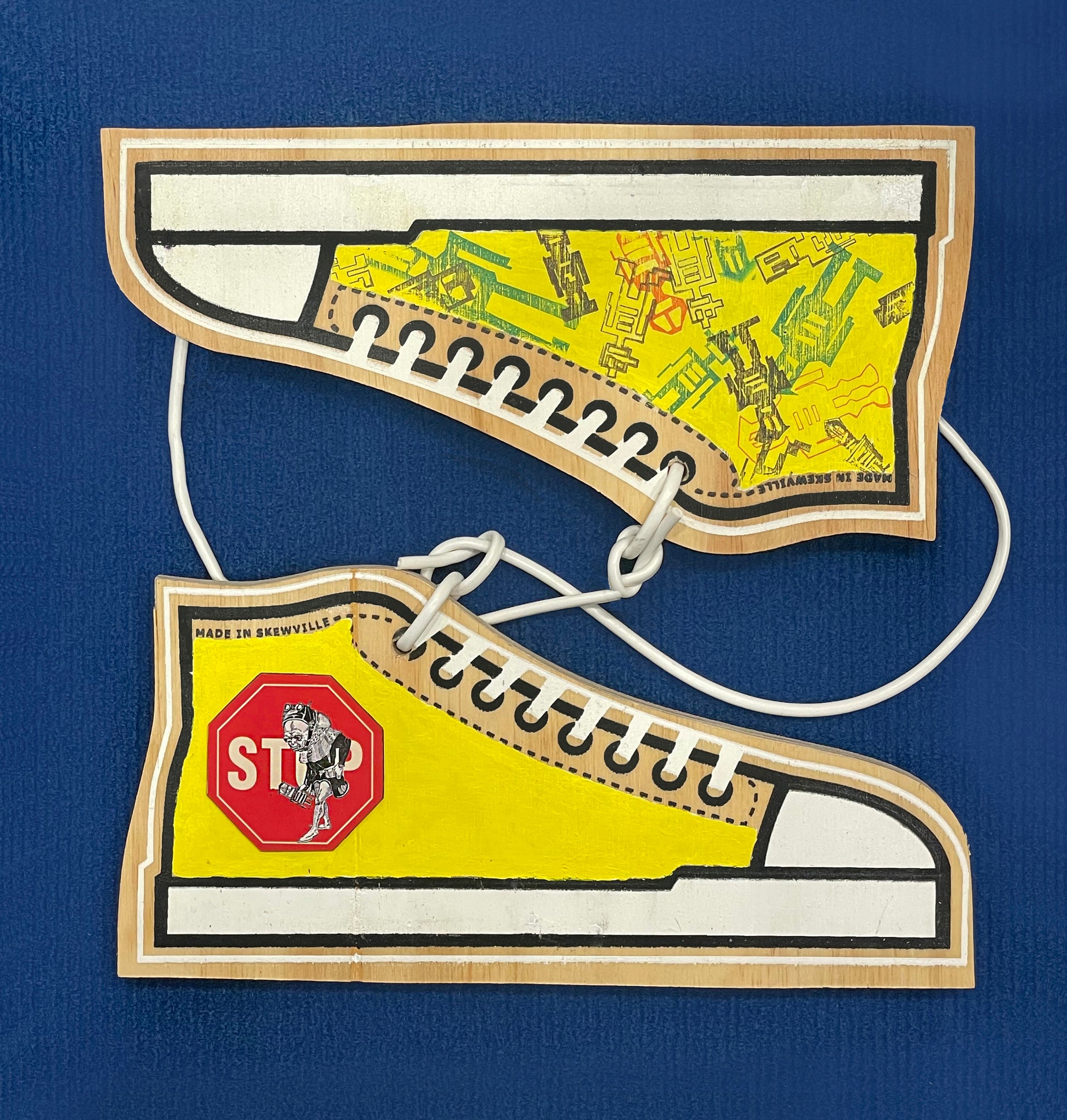 Silkscreen, Hand cut, drilled and laced by Skewville then Custom painted by Stikman