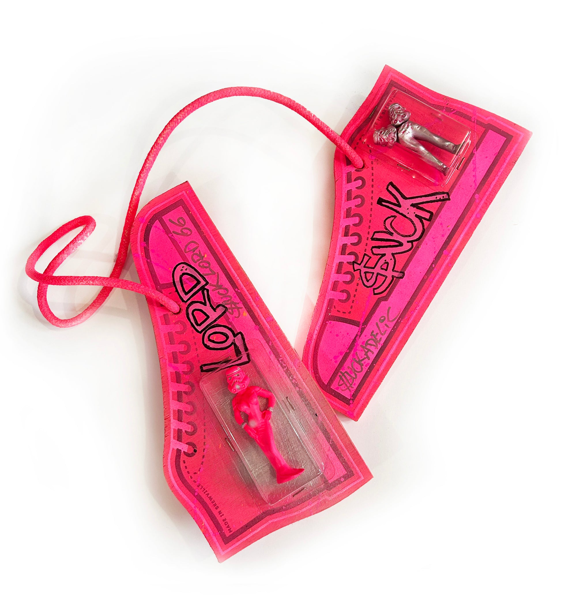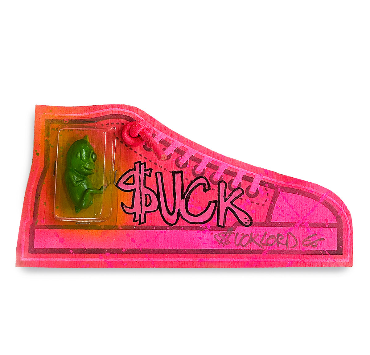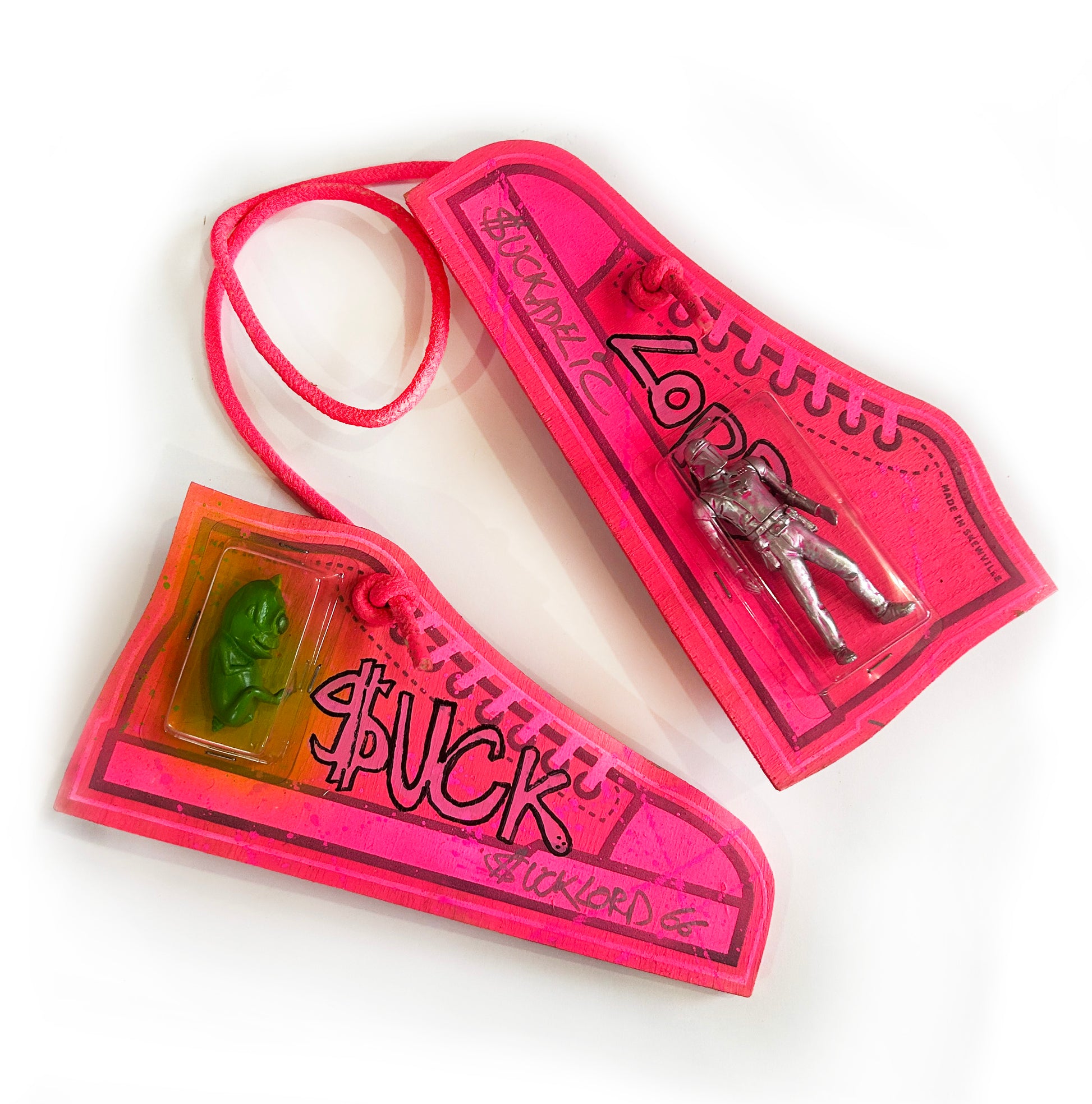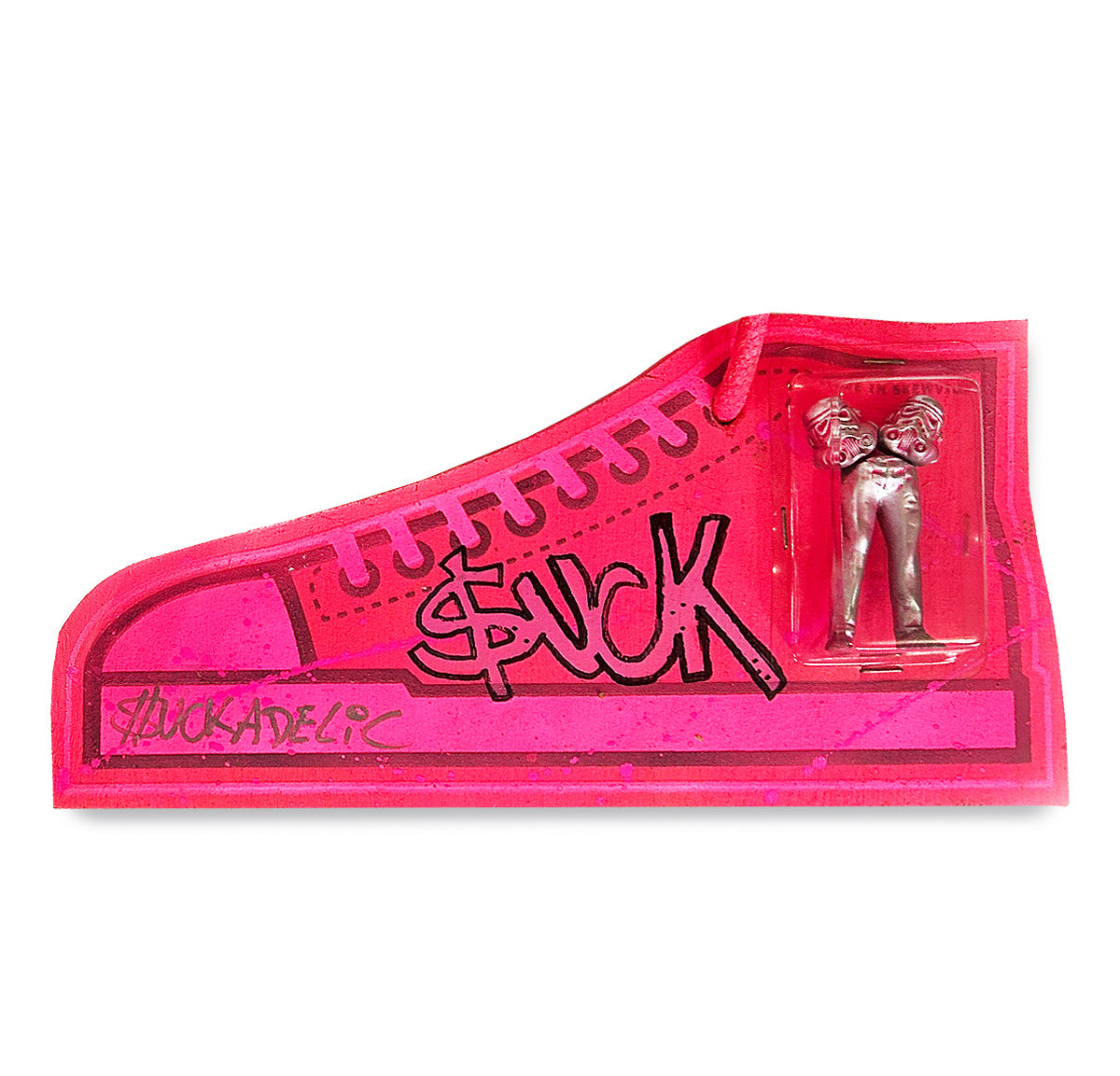 One Pair (Two double-sided wooden shoes total) of Artist customized Skewville wooden shoes. Each shoe measures 11″ x 5.5″ x 0.5″ and is connected by pink laces and complete with 4 action figures