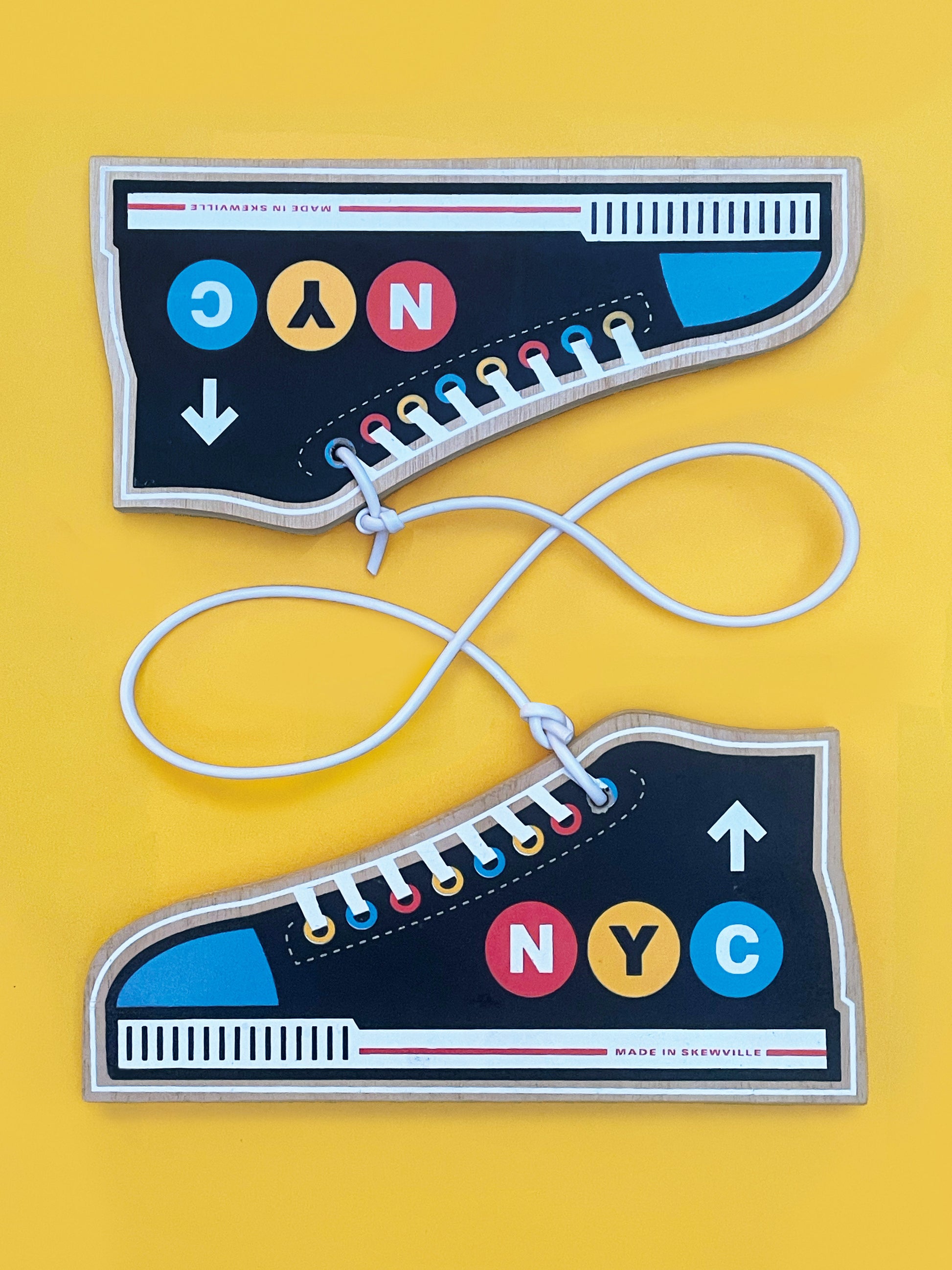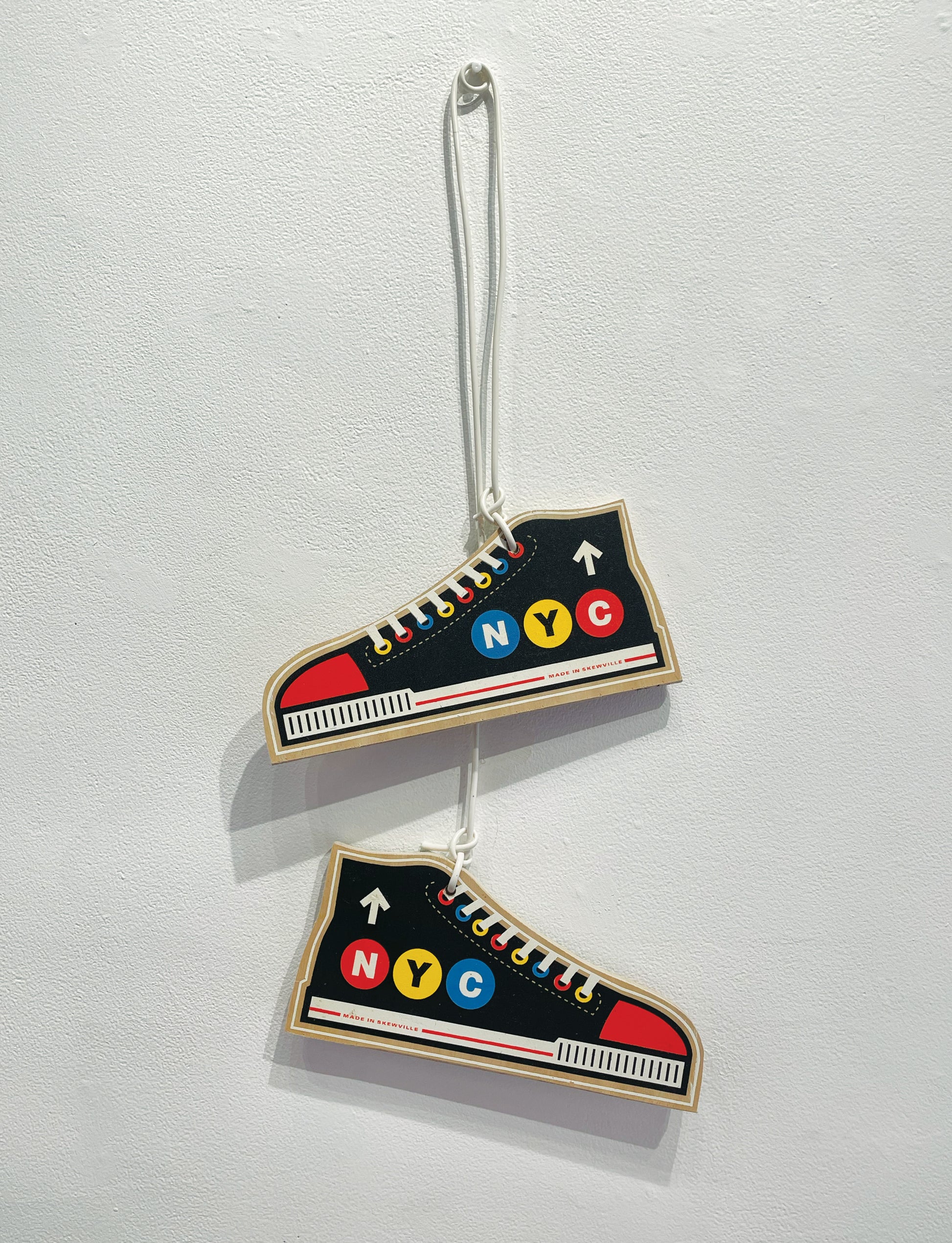 One Pair (Two wooden shoes total) of Silkscreened Sneakers by Skewville. Each shoe measures 11″ x 5.5″ x 0.5″. and and is connected by a white cord