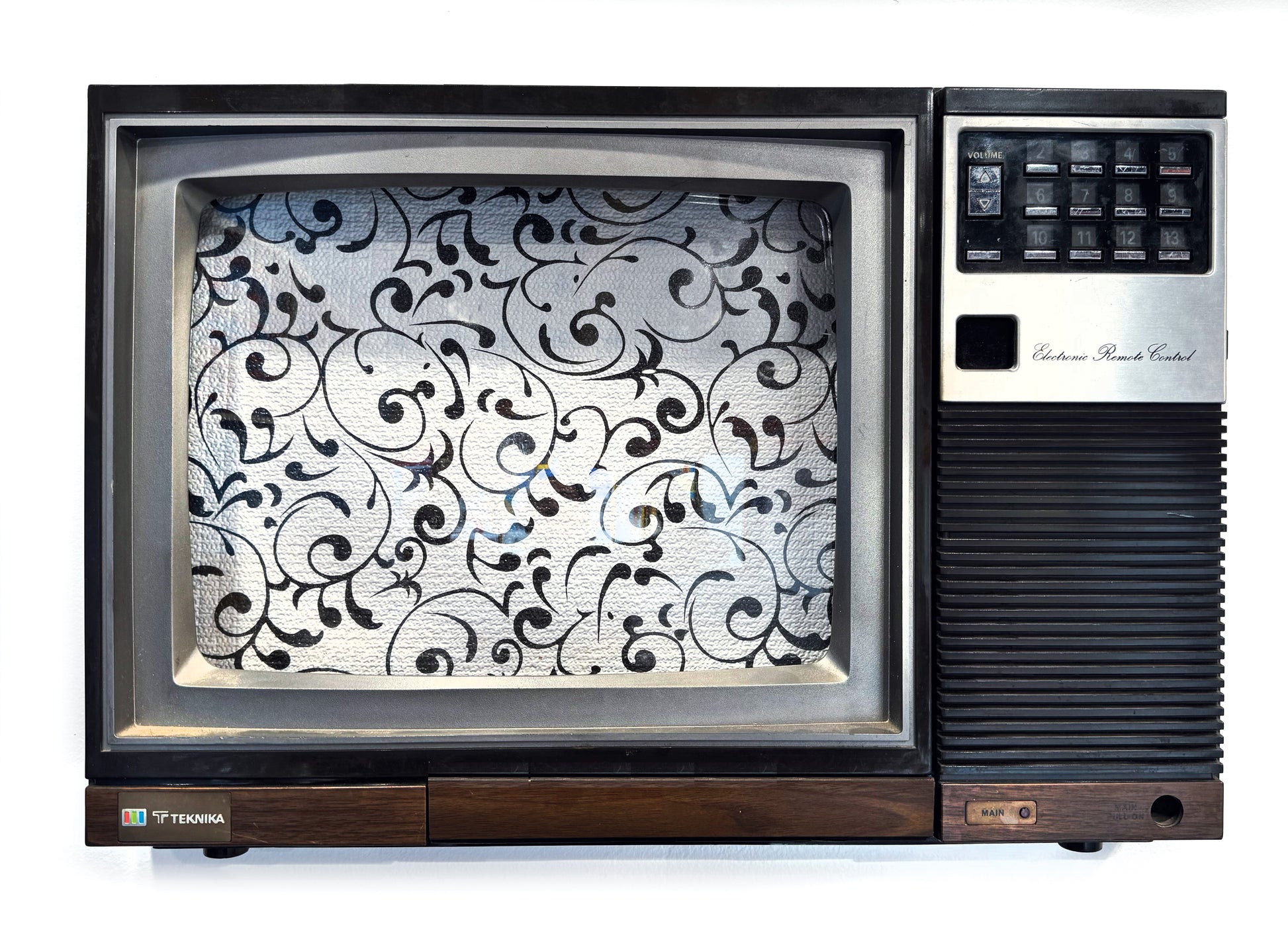 Manipulated Vintage TV with Classic wallpaper ready to hang on wall